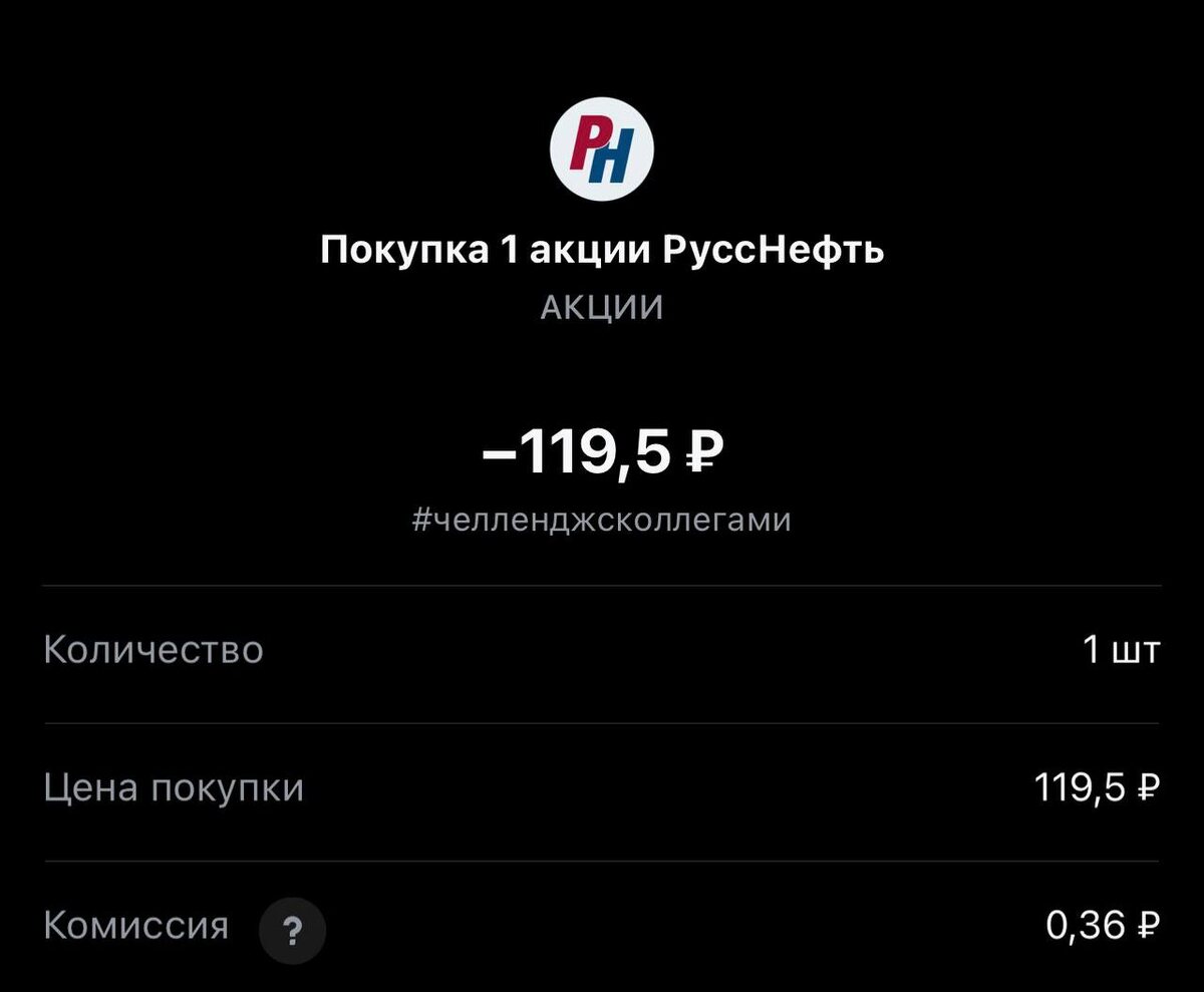 ! Покупка на сегодня #359 Статистика портфеля на стороннем сервисе, можно посмотреть по "ссылке" Напомню это челлендж с коллегами, каждый рабочий день пополняем брокерский счет на 250 рублей и инвестируем. Если возникли вопросы или есть не понимание, что делать. Задавайте «тут» Покупка #359 🟢 «РуссНефть» 119.5 rub #RNFT 3 лота #каждыйсможет #челенджсколлегами ✈️ Стас Мироненко