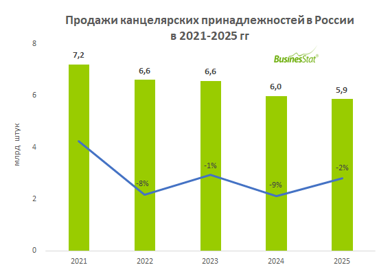 В 2021-2025 гг продажи канцелярских товаров в России сократились на 11%: с 7,2 до 5,9 млрд шт.