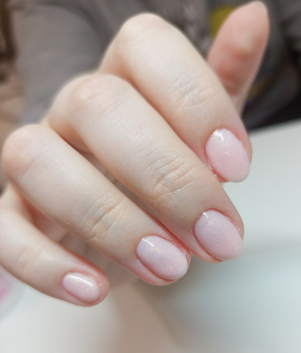 Есть у меня постоянная клиентка. Очень люблю с ней работать. Нашла меня на Авито, живёт в соседнем доме. В связи с тем, что у нее на работе крайне нежелателен яркий маникюр, она делает всегда одно и то же покрытие - жидкий гель от Lovia Cure - светло розовый с шиммером. Смотрится нежно и аккуратно.