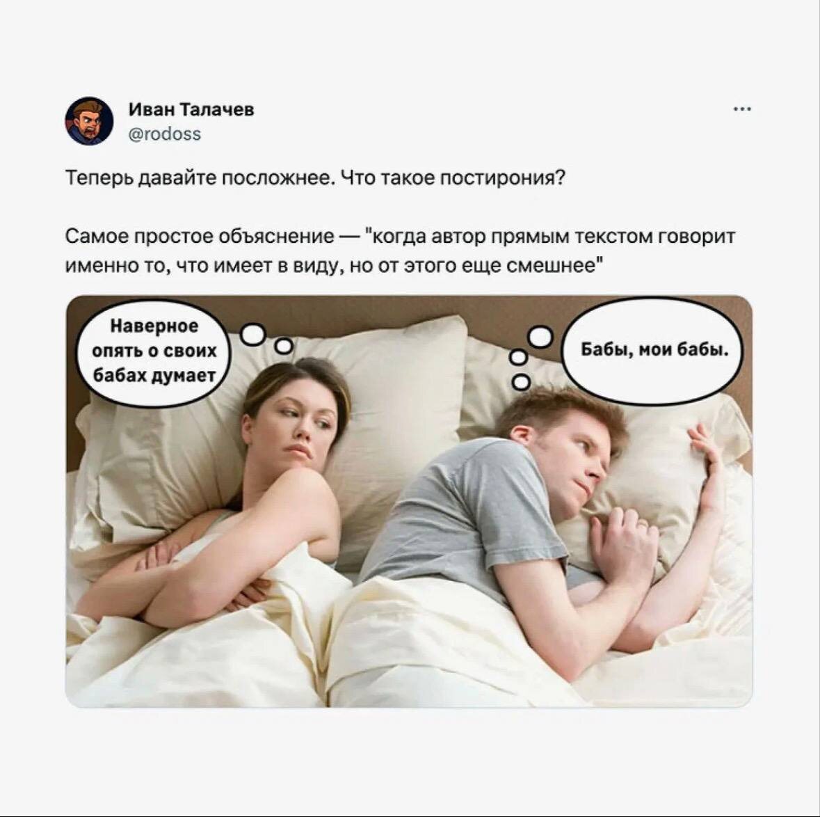 https://dzen.ru/media/id/6472dca417c2565626600129/nu-eto-prosto-potriasaiusce-69819bb4e9cfad75de461cd4 Постирония (пост-ирония) — это явление в современной культуре и коммуникациях, где границы между иронией, сарказмом и серьёзностью намеренно размыты. Простыми словами, постирония — это ирония над иронией, когда становится сложно отличить шутку от реальности.