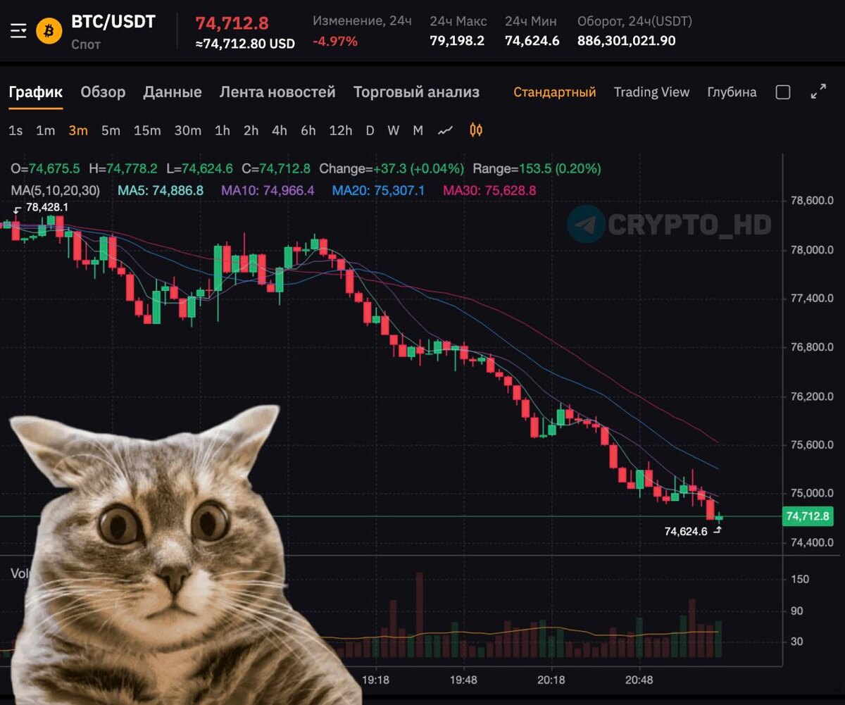 📉 Биткоин < $75,000