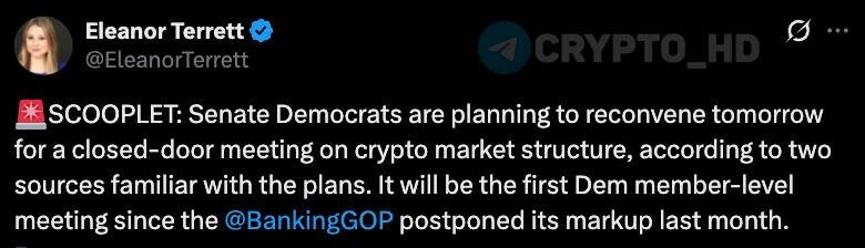 🇺🇸 Eleanor Terrett: Сенаторы-демократы планируют завтра собраться на закрытое заседание, посвященное законопроекту о структуре крипторынка (CLARITY). Это первое заседание на уровне членов Демократической партии с тех пор, как Банковский комитет Сената отложил рассмотрение CLARITY в прошлом месяце. Crypto Headlines