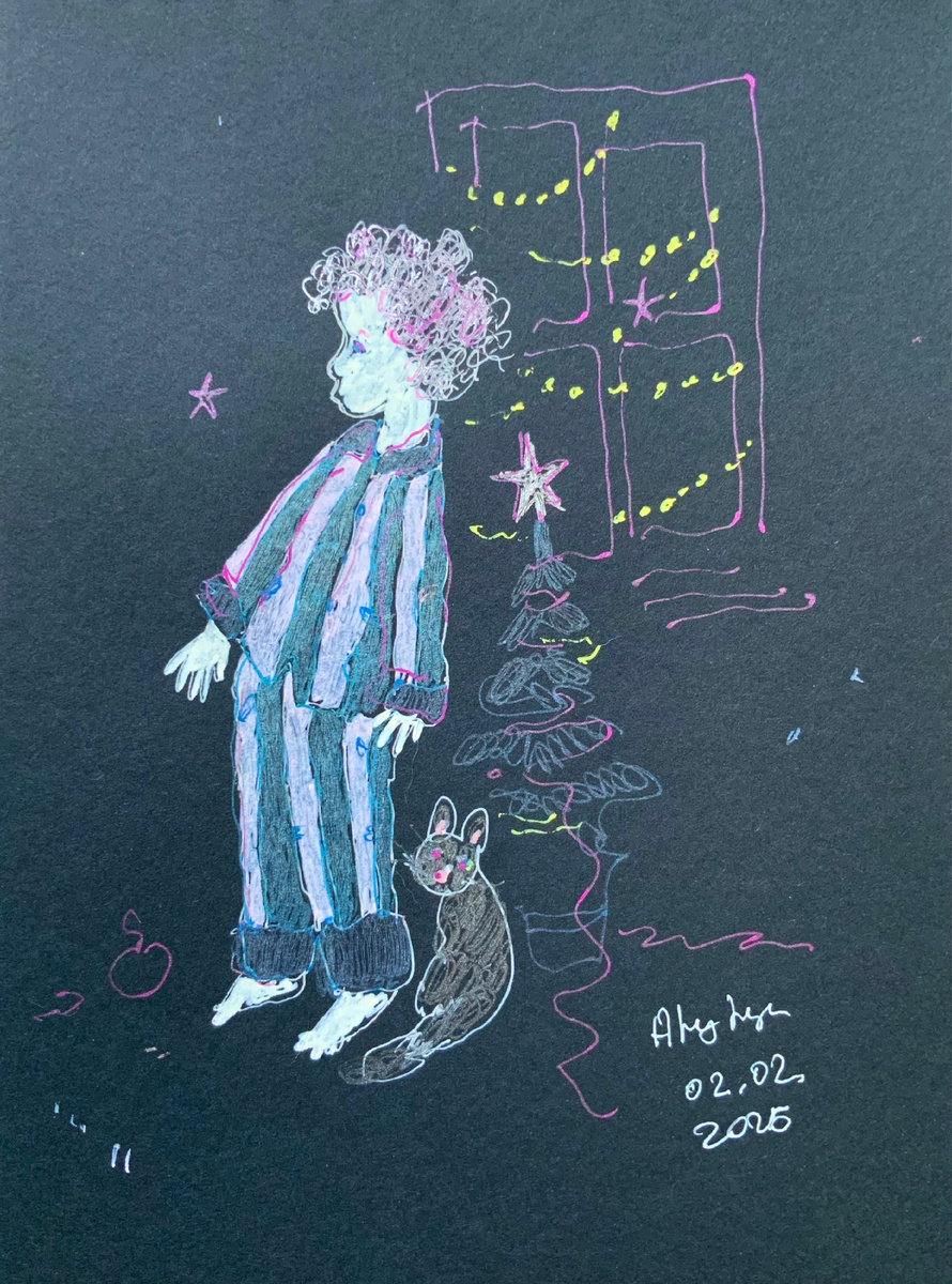 Малыш и котенок любуются яркими гирляндами, прежде чем пойти спать 🐱 ✨ 🧒🏼 💤 🎄