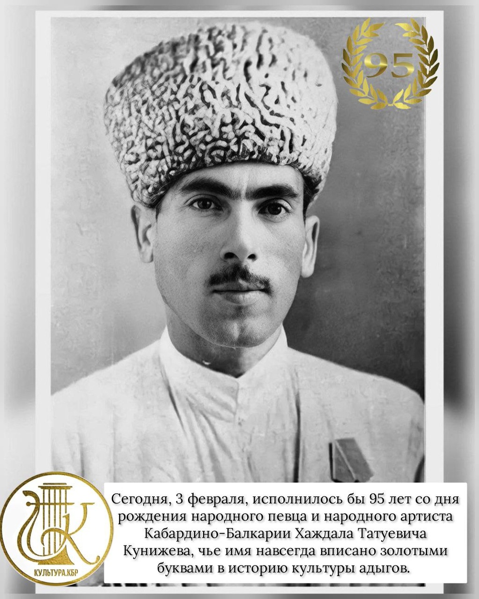 Сегодня, 3 февраля, исполнилось бы 95 лет со дня рождения народного певца и народного артиста Кабардино-Балкарии Хаждала Татуевича Кунижева, чье имя навсегда вписано золотыми буквами в историю культуры адыгов. Он был одним из самых популярных исполнителей прошлого. Жители республики с нетерпением ждали радиопередачи, в которых участвовал артист. На сцену Хаждал Кунижев попал случайно. Было это в 50-х годах прошлого века. На выездном концерте музыканты услышали, как поет молодой сельский житель. В результате его пригласили солировать в профессиональный ансамбль. Хаждал Кунижев исполнял разноплановые песни – старинные сказания и плачи, классические произведения, шуточные народные… За большой вклад в развитие национальной культуры в 91 году ему присвоили высокое знание «Народный артист Кабардино-Балкарии». Как я давно уже хотела, чтобы в интернете появилась хоть какая-то информация о Хаждале Кунижеве. Минимальное, что я смогла сделать, — это опубликовать два года назад в электронном изда