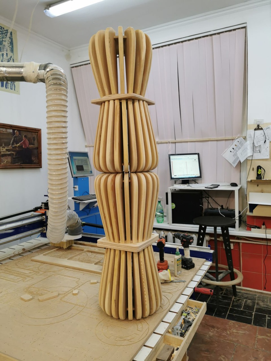 Попросил нас знакомый заказчик сделать необычную скамейку. За основу взят ГРИБ. Думали как её реализовать технологически. Был первый вариант самой подставки (ножки), заказчик, мало вертикальных ламелей, нужно сделать больше, что бы было меньше просвета. Инженерное творчество взяло верх, сделали. Внесли свои изменения в крепление ножки (дерево имеет свойство расширяться и сужаться) и ещё, что бы было удобно транспортировать само изделие, сделали овальные крепёжные отверстия. И вот представляем Вам готовое изделие. Сверху ещё будут мягкие пуфики. Это шедевр.
