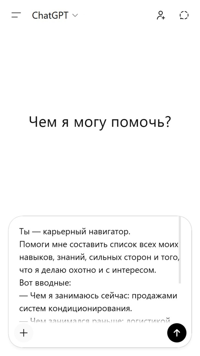 Привет, друзья! ChatGPT поможет выявить ваши сильные стороны и найти нишу, где вы будете максимально востребованы: всего за несколько минут вы сможете определить 5 направлений на пересечении ваших навыков, рыночного спроса и низкой конкуренции: Промт 1: Ты — карьерный навигатор.