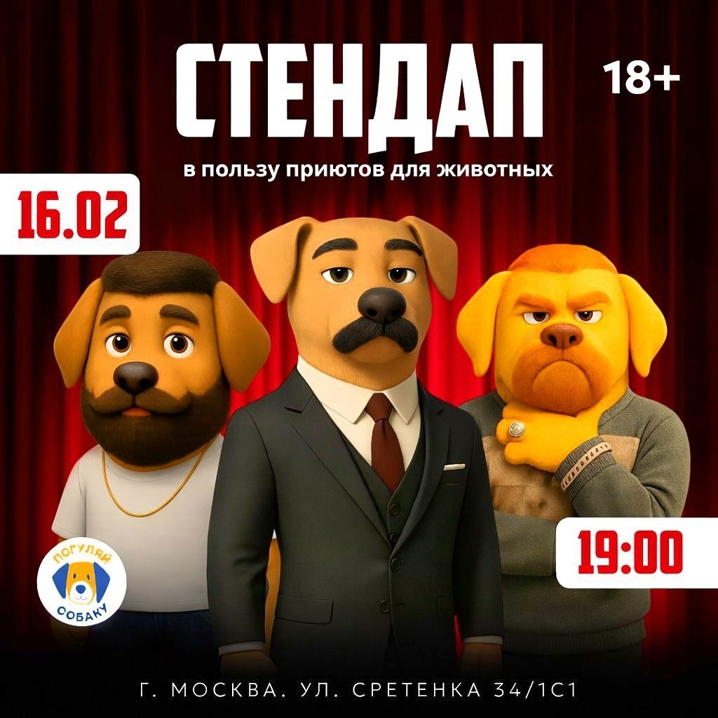 ! 16 февраля проведем в Москве благотворительный стендап в пользу приюта Хэлпдог из Саратова! Волонтерское движение "Погуляй собаку" и Стендап-клуб Comedy 34 каждый месяц проводят благотворительные стендапы с участием комиков с ТНТ и Youtube, а все собранные средства за билеты отправляем в приюты для бездомных животных 📆 16 февраля, 19.00 🗺 Comedy 34, ул. Сретенка, 34/1с1, 2 мин от м. Сухаревская 🎫 Билет 600 р: https://clck.ru/3RUfSg Приходи провести вечер с пользой для братьев наших меньших! 🐶🐱 #ПогуляйСобаку #Comedy34 #Стендап