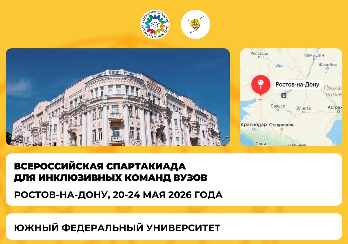 ✨ Минобрнауки России анонсирует Всероссийскую Спартакиаду для инклюзивных команд вузов. Мероприятие направлено на развитие адаптивной физкультуры и спорта, интеграцию и социализацию студентов с инвалидностью и ОВЗ в образовательную среду, укрепление преемственности в спорте и формирование активного образа жизни. Спартакиада состоится в Ростове-на-Дону. Предварительные даты проведения: 20–24 мая 2026 года. Операторы – Южный федеральный университет, 😁 РУМЦ ЮФУ. 🔜 Приглашаем к участию инклюзивные команды студентов всех форм обучения. Для подтверждения участия или получения дополнительной информации сообщите на почту: rumz@sfedu.ru. Телефон для связи: +7 (863) 218-40-00, доб. 10188; +7 (8634) 68-08-90, доб. 10188. 💬 Сеть РУМЦ ИВО в МАХ | РУМЦ ЮФУ