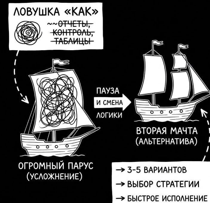 Когда появляется конкретика, есть новая опасность - провалиться в "как". Там можно жить неделями: процессы, регламенты, контроль, созвоны. Снаружи выглядит как управление. А внутри иногда это просто страх выбрать стратегию. Я этим болел. Я пытался ускорить проект, усиливая контроль. Еще один отчет. Еще одна точка координации. Еще одна таблица. А потом в какой-то момент до меня дошло: вместо того чтобы шить огромный парус, иногда надо поставить вторую мачту. Парус больше - это усложнение внутри старой логики. Вторая мачта - альтернативный путь решения. Сейчас я делаю паузу перед деталями: выписываю 3 - 5 вариантов стратегического хода и выбираю самый эффективный с учетом ограничений. И только потом раскладываю "как". Сначала выбираю вариант, который кажется оптимальным и потом стараемся делать его быстро. 🫡 --- Канал: 🧠 Второй Мозг