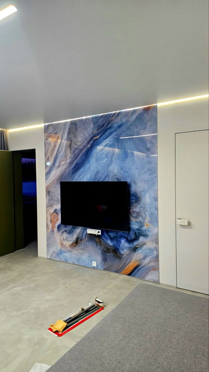 Выполнена профессиональная установка двух декоративных стеновых панелей из коэкструзионного карбонизированного бамбука в гостиной. Панели стилизованы под голубой мрамор и гармонично сочетаются с белым интерьером помещения. Перечень выполненных работ: Использованные материалы: