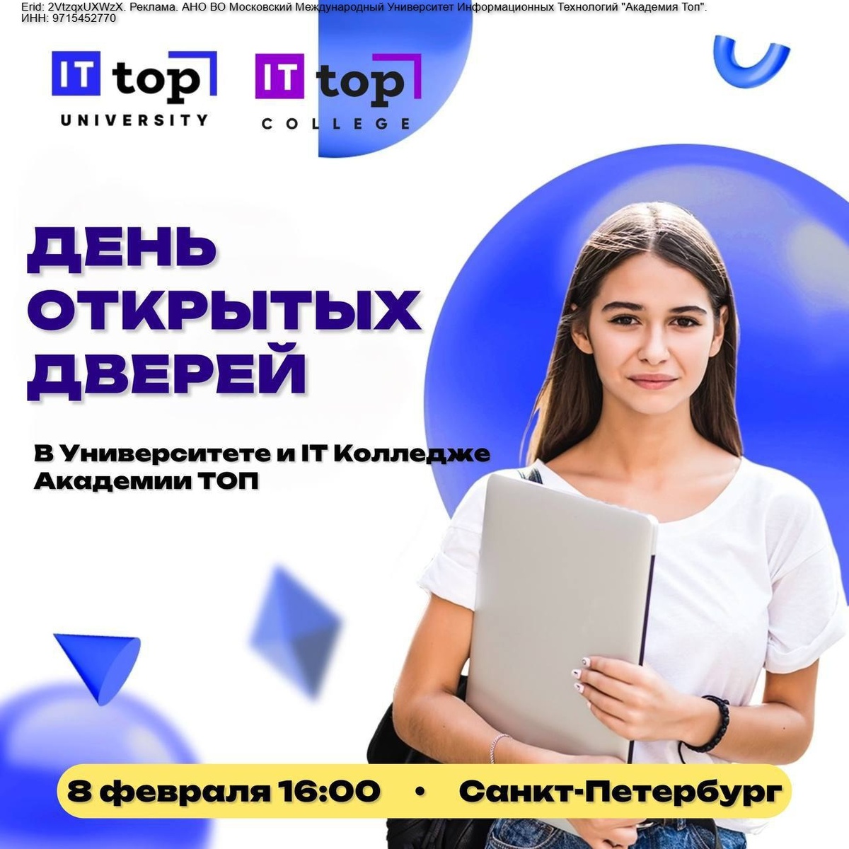 ! 🍂Университет и IT Колледж Академии ТОП приглашает вас посетить день открытых дверей. 🗓 8 февраля 16:00 📍 ул. Итальянская, 2 👥 16-20 лет День открытых дверей в университете информационных технологий «Академия TOП» 👥 14-20 лет День открытых дверей в колледже Академия ТОП 📌 Сейчас — лучшее время посетить день открытых дверей, чтобы обеспечить себе место в группе и уверенно войти в новый учебный год. Бесплатно по регистрации на сайте. 📞 +78126026696
