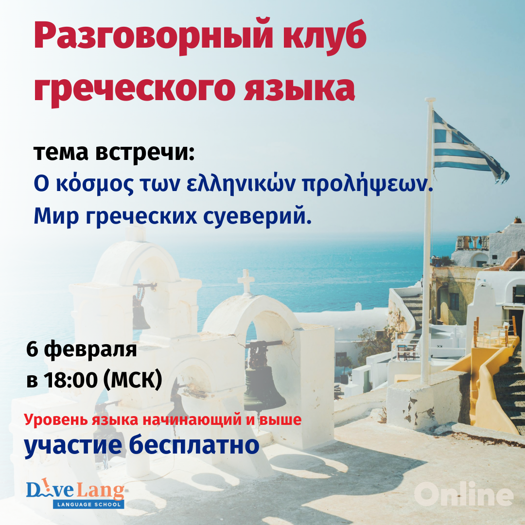Тема встречи: Ο κόσμος των ελληνικών προλήψεων. Мир греческих суеверий. Встречаемся 6 февраля в 18:00 (пятница) 👨🏫 Преподаватель: Галини 📍 Онлайн, в Яндекс Телемост *чтобы без задержек присоединиться к встрече, скачайте приложение Яндекс Телемост Уровень языка: А1 и выше Хотите заглянуть за кулисы повседневности и понять, какие «невидимые правила» управляют удачей, общением и жизнью в Греции? Тогда - добро пожаловать на встречу разговорного клуба. Мы совершим путешествие в мир греческих примет и суеверий: Присоединяйтесь к этому путешествию в страну живых традиций! Мы не только выучим новые слова, но и начнём понимать тот тайный язык знаков и символов, на котором греки говорят каждый день. Регистрируйтесь и присоединяйтесь к клубу. Чтобы увидеть Грецию с её самой загадочной и человечной стороны. Καλή μας τύχη! Для регистрации на встречу, переходите в наш телеграм канал - https://t.me/divelang