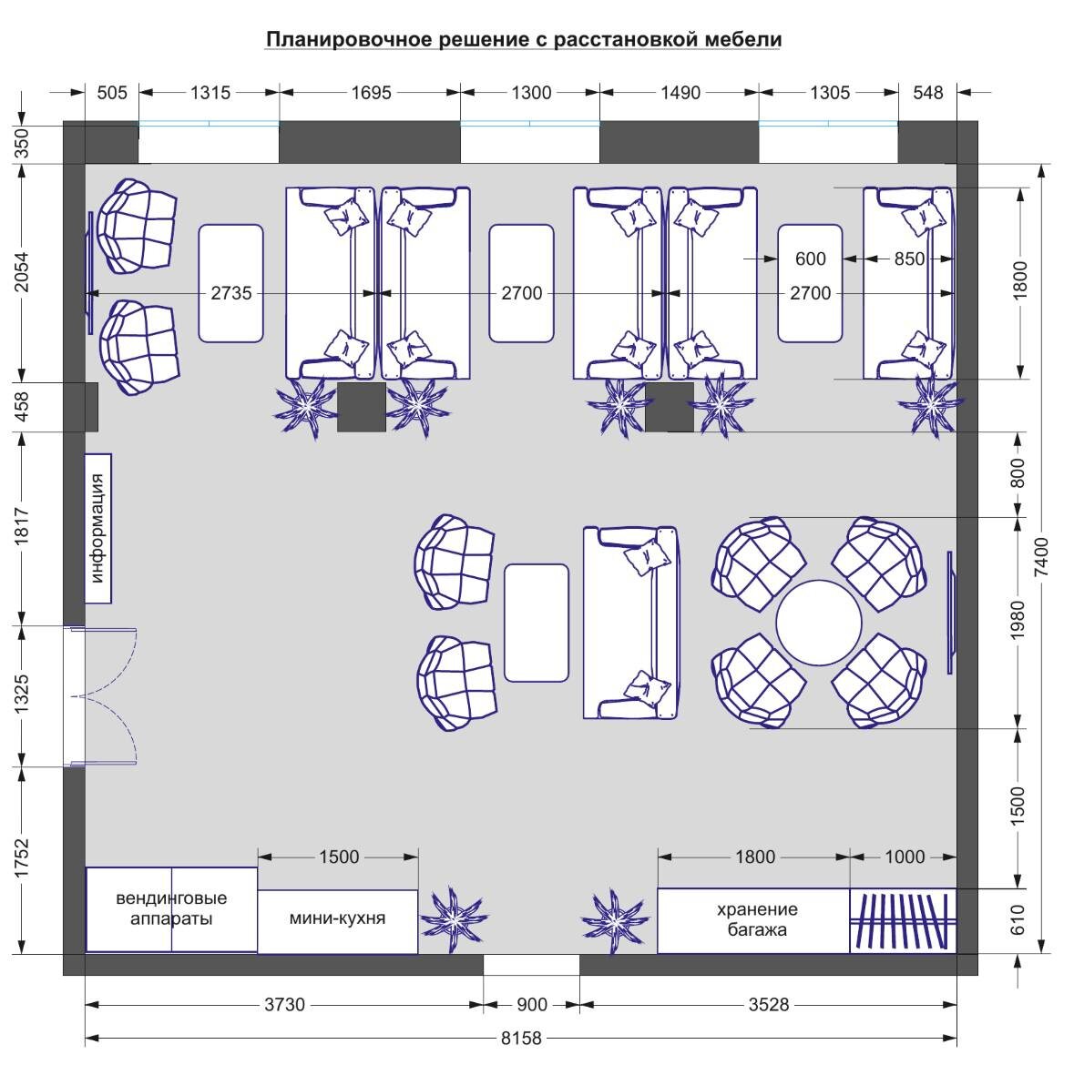 ). По техническому заданию, нужно было разместить зонами диваны со столиками, шкаф для временного хранения багажа и верхней одежды гостей, мини-кухню, вендинговые аппараты и т.д. Стиль интерьера должен перекликаться со стилем холла санатория. Напольный паркет, двери и окна остаются прежними.