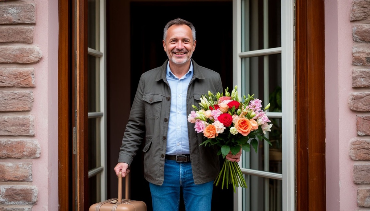 Павел стоял на пороге с чемоданом и букетом цветов и смотрел на Нину так, будто ждал, что она бросится ему на шею.