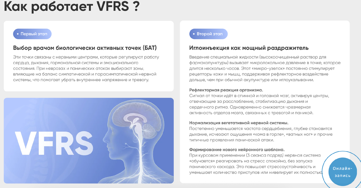 Действие VFRS идет через введение миорелаксантов (магний) и нейромодуляторов (лидокаин), физиологического раствора, высокоочищенного раствора для инъекций, гомеопатических растворов в паравертебральные точки конкретного сегмента позволяет избирательно гасить симпатическую гиперактивность там, где она выражена больше всего. Например, инъекции в грудной отдел (T1-T5) влияют на иннервацию сердца и лёгких, напрямую снижая тахикардию и ощущение нехватки воздуха ключевые симптомы паники. Научное обоснование: Доказано, что магний, действуя как антагонист NMDA-рецепторов, снижает симпатический тонус и тревогу [[1]].