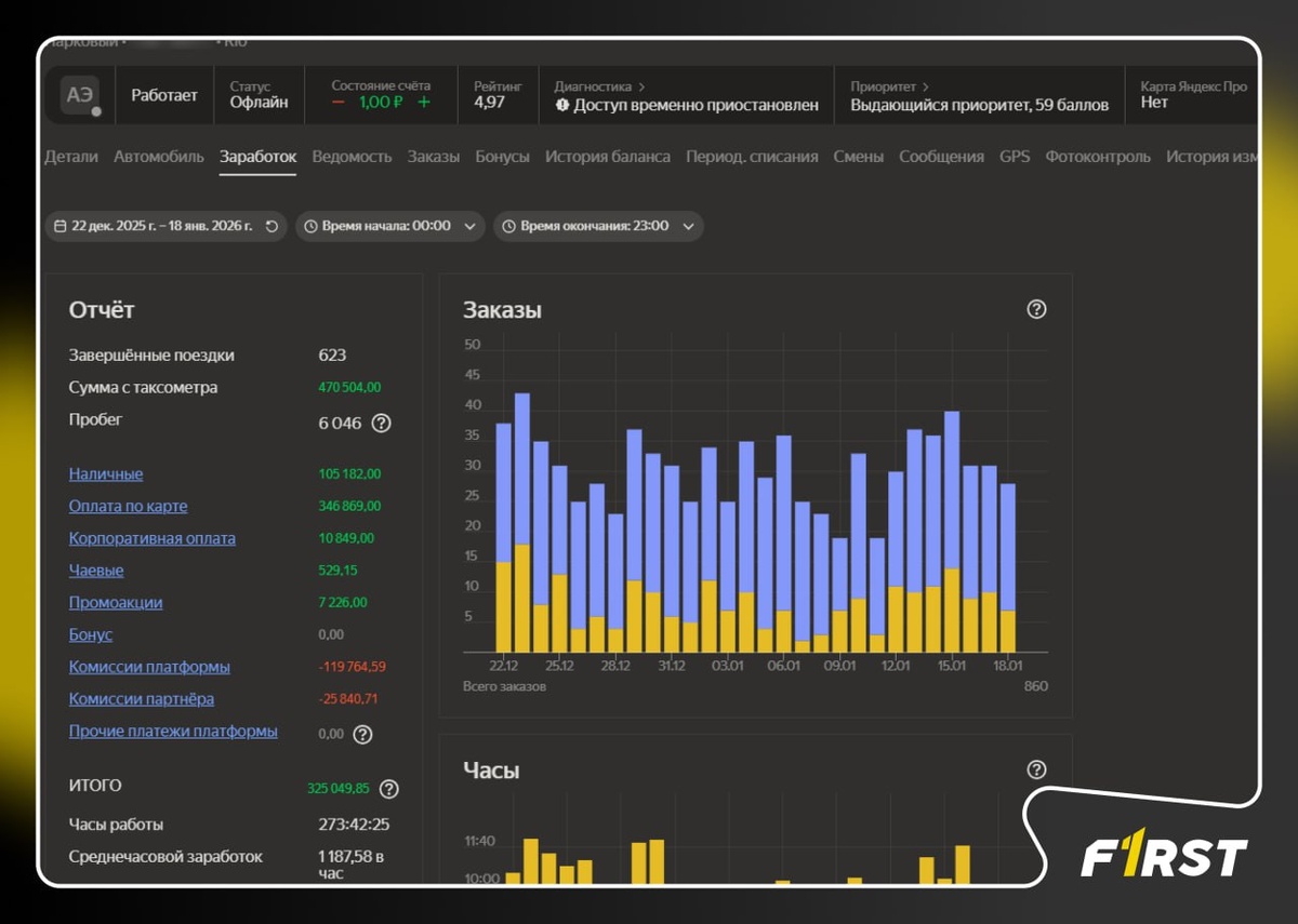 " Самый интересный кейс🤓 Выручка: 470 655 ₽ Комиссии: 145 604 ₽ Налог: 0 ₽ 🤫 Время на линии: 273 часа, 28 дней, по 10 часов в день Авто: Kia Rio, 2 300 ₽/сутки, 64 400 ₽ за всю гонку Пробег: 7 000 км примерно Бензин: 45 000 ₽ Мойка: 4500 ₽ самообслуживание через день Тариф: "Эконом" Доход в час по Яндексу: 1719 ₽/час (Выручка минус комиссия Яндекса) Штрафы: 2030 ₽ Рейтинг в Я.Про: "Эксперт" 💸 ЧИСТАЯ ПРИБЫЛЬ: 209 121 ₽ ⏰ Чистый доход в час: 766 ₽/час, у Киборга 769 ₽/час, у Макса 1020 ₽/час (с "Легендой") Я созвонился с Эльмиром и коротко уточнил основные нюансы по работе: ⬇️катает в основном в "Эффективном"; ⬇️иногда включает "МР" на 4% комиссии, то есть половина Москвы; ⬇️районы работы обозначил так: от Проспекта мира до Кутузовского, от Садового кольца до МКАДа. Эльмир красавчик 💯 но есть ощущение, что Максим в К+ все-таки его обгоняет по чистой прибыли в час. Но у Макса "Легенда", поэтому разница скорее всего небольшая. Осталось разобрать второе место в "Комфорте" и наконе