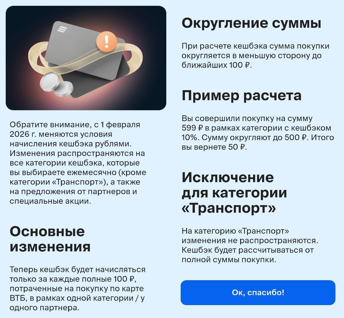 ВТБ в 2026 году постепенно ухудшает программу лояльности. С 1 января 2026 г. отменили кэшбэк в супермаркетах для участников группы Близкие. С 1 февраля 2026 г. кэшбэк начисляться за каждые 100 ₽ от суммы покупки, добавлены новые исключения в программу лояльности. А некоторым клиентам банк угрожает снизить размер кэшбэка до 1% в случае невыполнения условий. Оперативную информацию о кэшбэках вы можете найти в нашем Telegram-канале, не забудьте подписаться: 🔔 Подписаться на Telegram-канал В нашем чате есть специальная тема для обсуждения кэшбэков и акций от банков: 👉 Чат по теме Кэшбэк и акции от банков ❗ С 1 января 2026 г. акция с кэшбэком в супермаркетах для участников группы Близкие завершена. Гарантированный кэшбэк 5% доступен только в первые 30 дней для новых участников. Клиентам с Привилегией дают максимум 2-3%. ❌ С 1февраля 2026 г. округление для выплаты кэшбэка стало кратно 100 ₽ (кроме категории Транспорт, там от любой суммы), ранее округление производилось по математическим пр