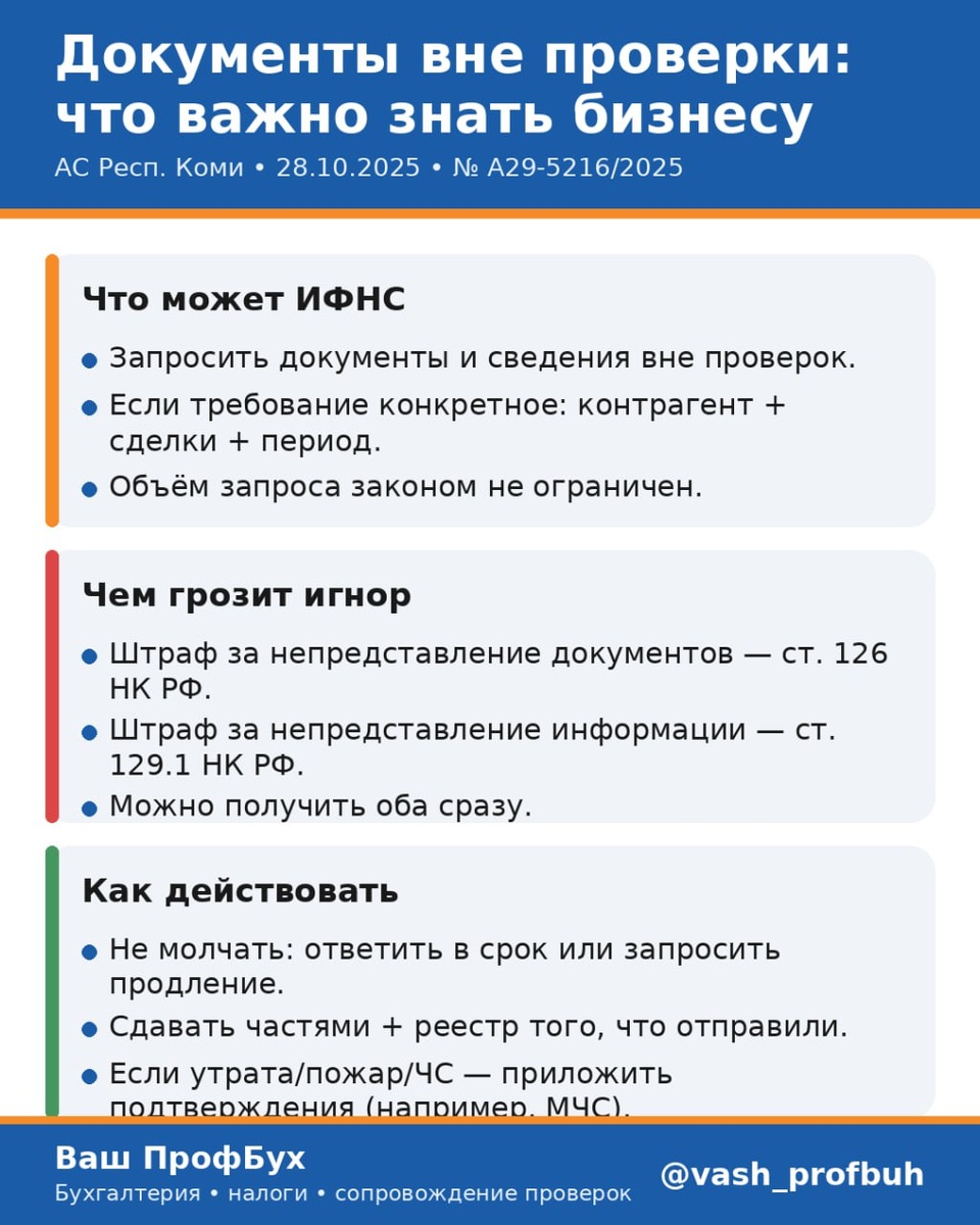 Есть миф: “Если проверки нет — можно не отвечать/отписаться, что запрос слишком большой”. Спойлер: не работает. 📌 Судебная практика: Постановление АС Республики Коми от 28.10.2025 № А29-5216/2025 — выиграла инспекция. Инспекция вне проверки запросила у компании первичку по одному контрагенту за 5 лет (2019–2023). Компания отказалась → получила два штрафа и проиграла в суде. Что важно ✅ Налоговики вправе истребовать документы вне проверок, если это про конкретные сделки. ✅ Лимита “сколько документов можно запросить” — нет. ✅ И самое неприятное: можно получить двойную ответственность: за непредставление документов (ст. 126 НК РФ) и за непредставление информации (ст. 129.1 НК РФ) Суд сказал простую вещь: если в требовании нормально прописаны контрагент + виды сделок + период, то “много” — не аргумент. 🧠 Как действовать, если прилетело требование “на 200 страниц” Мини-чек-лист без паники: ✅ Проверьте формальности требования: кто запрашивает, что именно, за какой период, по каки