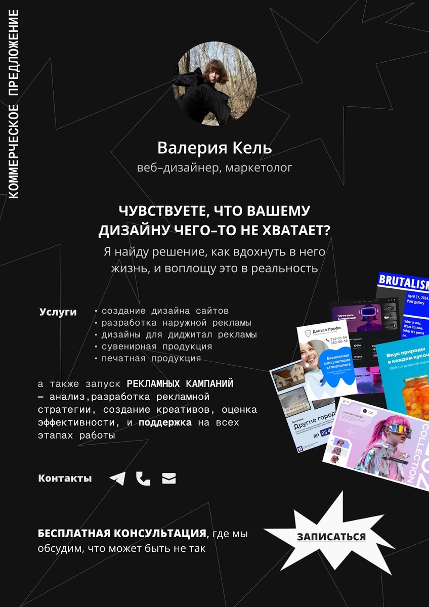 А Валерия Кель к 4 курсу поняла, что классический маркетинг не для нее, зато web-design ей нравится и вдохновляет на открытия. Поэтому еще в середине обучения она создала свое Коммерческое предложение с перечнем услуг.
