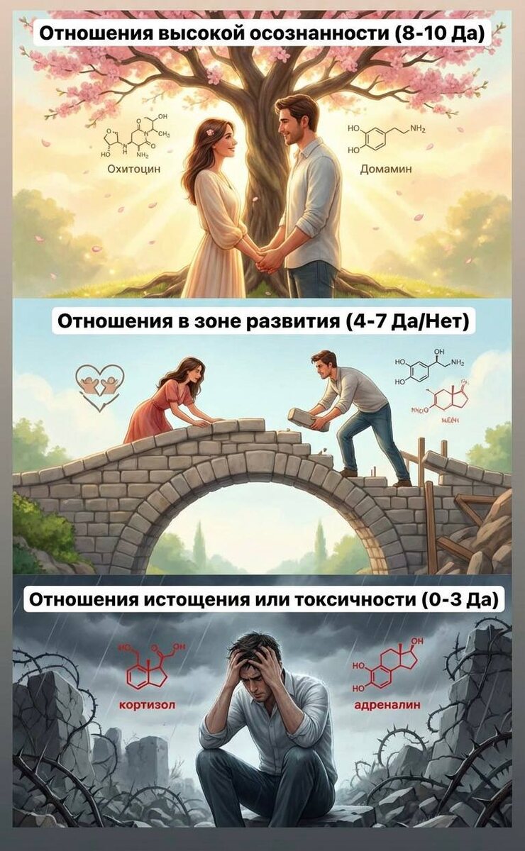 ⬇️ В основном ответы «Да» (8-10): Отношения высокой осознанности. Ваша связь строится на безопасности, взаимном уважении и питательном контакте. Это пространство, где вы можете восстанавливаться, расти и быть собой. Ваши взаимодействия, скорее всего, поддерживают здоровый гормональный фон (окситоцин, дофамин) и не вызывают хронического стресса (кортизол). Ваша задача — ценить, беречь и углублять эту связь. Примерно поровну «Да» и «Нет» (4-7): Отношения в зоне развития. В ваших отношениях есть здоровая основа и потенциал, но также есть «зоны напряжения» — области, где нарушены границы, не хватает безопасности или эмпатии. Эти отношения могут быть источником как радости, так и стресса, создавая нестабильный нейробиологический фон. Именно эти «зоны» требуют осознанного внимания и работы. В основном ответы «Нет» (0-3): Отношения истощения или токсичности. Связь, скорее всего, носит деструктивный или сильно дисфункциональный характер. Она регулярно активирует в вашем мозге центры угрозы