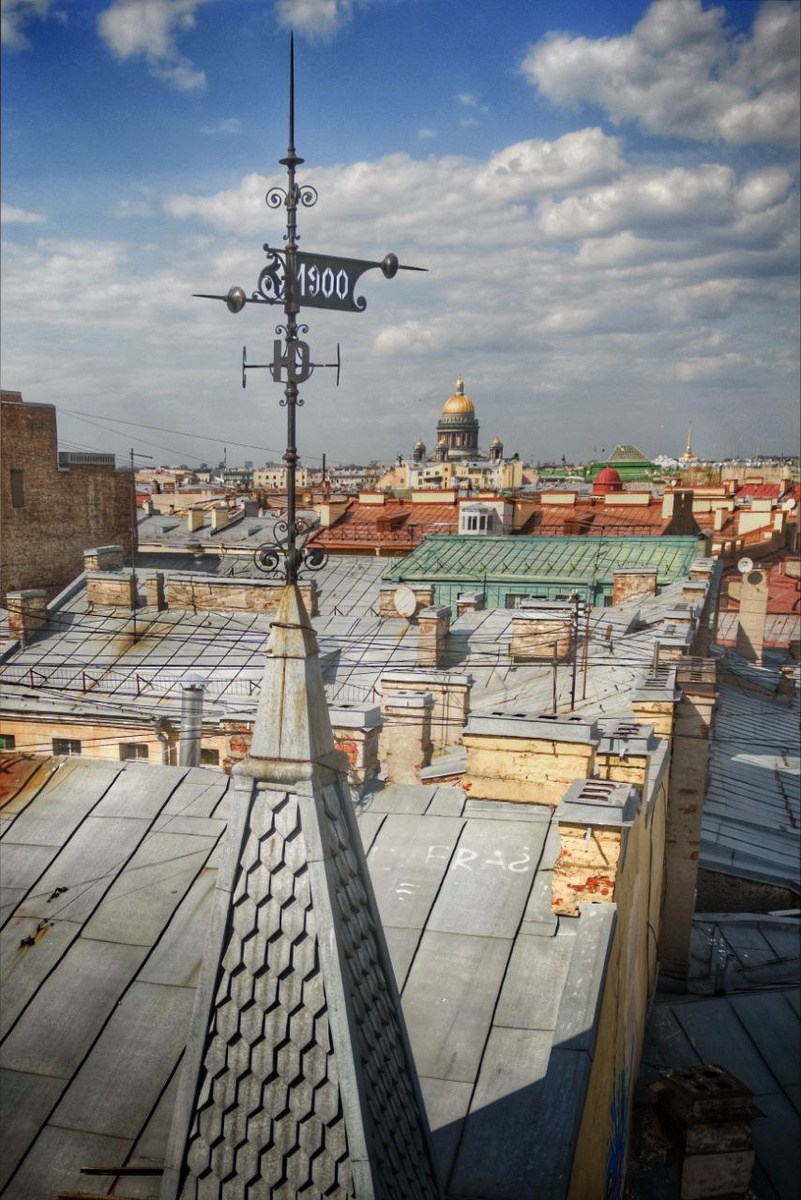 Флюгер с датировкой "1900" бывшего доходного дома действительного статского советника Андрея Андреевича Кушелева на проспекте Римского-Корсакова.