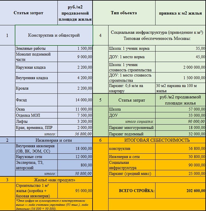 ✔️ Себестоимость строительства жилья в Москве "глазами девелопера". Сегодня в руки "нашей редакции" попал исключительно интересный материал от одного из столичных девелоперов. ✔️На картинке к посту структурировал себестоимость этапов строительства и общие показатели, которые важны для девелоперов. В комментариях к посту информация приложена в таблице excel. Интересно посмотреть на то, как считают деньги реальные участники рынка, которые работают в коммерческой системе координат. ✔️Обязательным ингредиентом является "социалка", которая показана в таблице как отношение к м2 продаваемой площади жилья и в стоимости за м2. Напомню, что в "государственной системе координат", Москва всё больше выбирает Столичный подход, который представляет собой смесь укрупнёнки + типовых проектов + выполнения по этапам. ПЫ.СЫ. как мне кажется, чем дальше будет реформироваться "советское ценообразование", тем больше будет необходимость в укрупнённых показателях стоимости строительства, так как уже сей