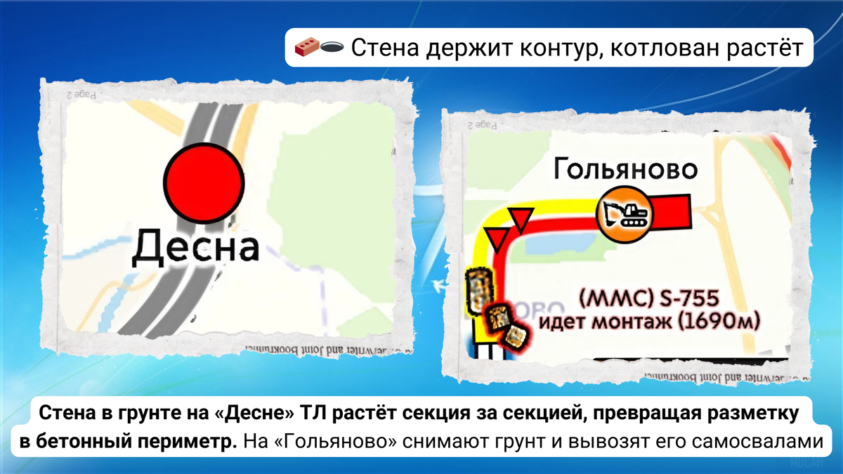официальные отчеты. Давайте вместе разберемся, что же на самом деле происходит с нашей Москвой. Поехали? На площадке 🚇 станции «Десна» 🏡 Троицкой линии ведутся работы по устройству стены в грунте (ограждения будущего станционного котлована). Раскрытие котлована 🚇 «Гольяново» Арбатско-Покровской линии продвигается к центральной части будущей станции, монтируется распорная система. 📷 2.5-2.6: В торцевой части ведётся подготовка к укладке бетона в основании котлована. --------------------------------------------