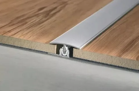 3. Алюминиевый порожек имеет Т-образный или подобный паз. Он надевается сверху на закрепленную рейку и защелкивается или забивается легкими ударами резиновой киянки.