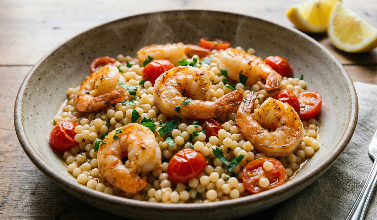 Сегодня у нас гастрономическое свидание с новым продуктом. Птитим — это не просто макароны, это израильская паста в форме жемчужин, которая обладает удивительной текстурой: упругая, не разваривается и идеально впитывает соусы. В компании с крупными креветками и яркой кислинкой лимона мы превратим этот простой гарнир в ресторанное блюдо за 15 минут. Легко, белково и умопомрачительно вкусно.