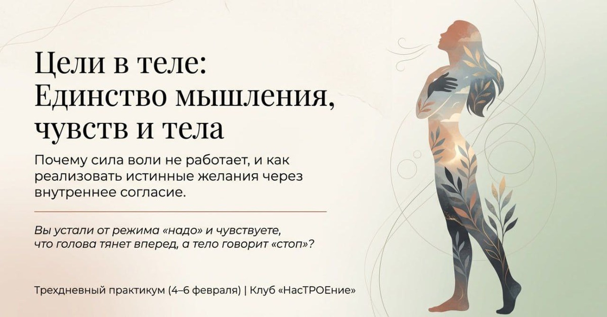 » Единство мышления, чувств, дыхания и тела для реализации своих истинных целей! 📍 Практикум для женщин, которые: 💙 устали от навязанных целей и режима «надо» 💙 много думают, но мало чувствуют 💙 ставят цели, которые гаснут уже на старте 💙 ощущают напряжение, зажатость, усталость в теле 💙 хотят двигаться к целям без выгорания и насилия над собой ПРОГРАММА ПРАКТИКУМА 🔜 День 1 - 04 февраля: Онлайн-встреча в Zoom в 18:00 по Мск Цель как опора в турбулентном мире ⏺ почему цели не работают, если жить только «из головы» ⏺ чем цель отличается от желания и ожиданий и навязанных сценариев ⏺ как хаос мыслей и напряжение в теле блокируют движение к целям Результат: ⏺ Начнёте чувствовать, в какой точке вы сейчас, и почему цели не реализовываются так, как вы этого хотите ⏺ Поймете, как различать: что действительно ваше, а что - нет. 🔜 День 2 - 05 февраля: Практическо-диагностический день, без встречи ⏺вы увидите своё будущее не умом, а через тело ⏺ почувствуете, какие сценарии вам