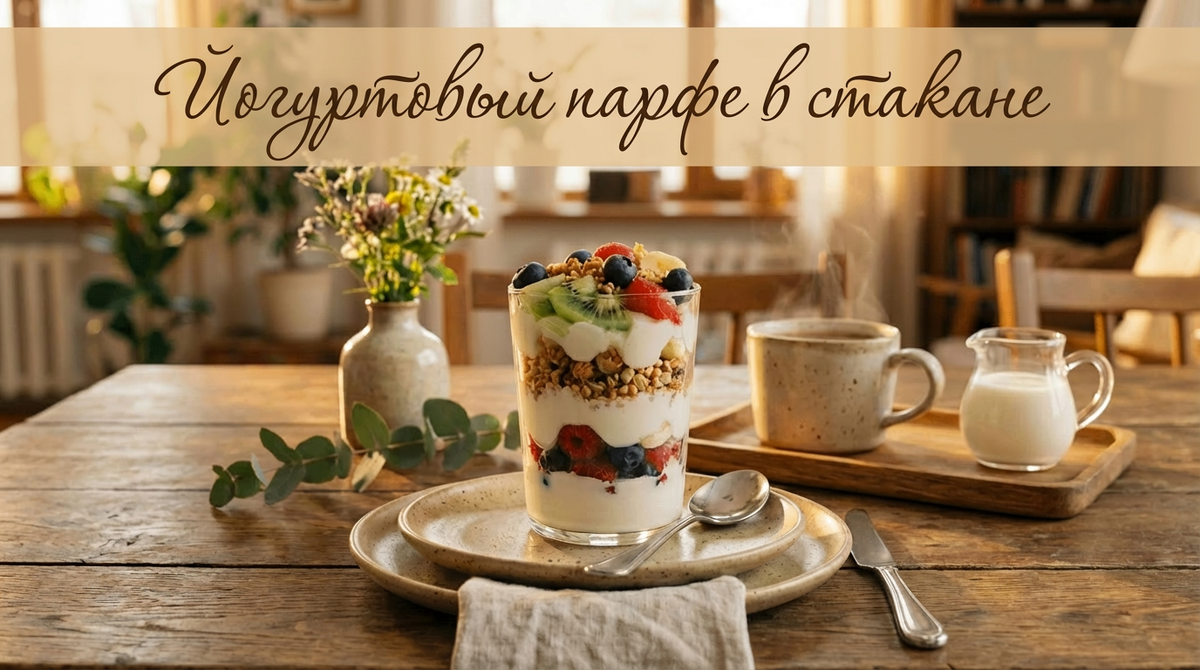 йогурт → ягоды/соус → гранола → йогурт → фрукты → немного гранолы сверху. 4. Финал: укрась ягодой, посыпь миндальными лепестками или капни арахисовой пастой «ниточками». В йогурт добавь 1–2 ст. л. творожного сыра (или мягкого творога) + мёд — получится плотнее и прям «десертно».