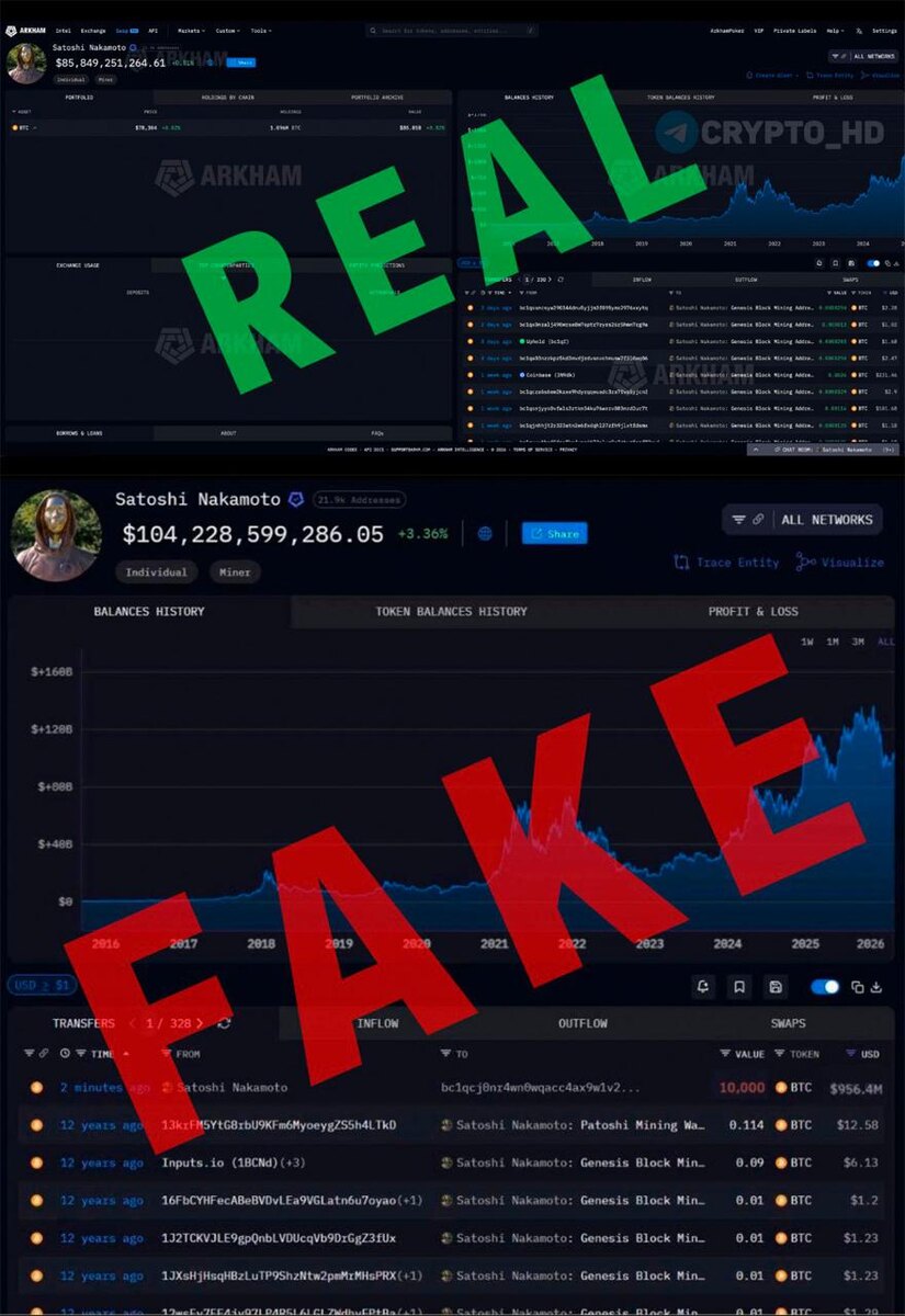 🤨 «Сатоши Накамото перевел 10,000 BTC» – уже несколько дней в Twitter форсят ФЕЙКОВЫЕ скрины с Arkham с подобной информацией.