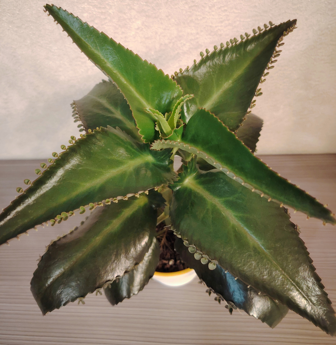 🪴 Визитная карточка каланхоэ Дегремона - "живорождение". По краям каждого листа образуются маленькие детки - выводковые почки. У деток есть зачатки корней, падая на почву они мгновенно укореняются.