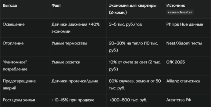 - Экономия на ЖКХ до 30%: Термостаты снижают расход тепла на 15–25%, датчики света экономят 40% электричества. В 2-комнатной квартире это 5–10 тыс. руб. в год.