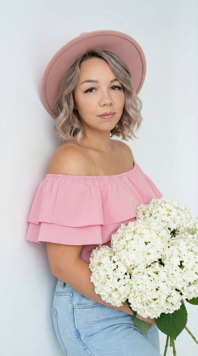 👇🏻 🌟Переходим на удобный сервис для генерации: Ссылка 👉 Syntx Ai Ссылка 👉 Veo3 📌ИНСТРУКЦИЯ ПО ИСПОЛЬЗОВАНИЮ В ЗАКРЕПЛЕННЫХ СООБЩЕНИЯХ ◾️ПРОМТ : Черты лица не менять Молодая девушка в центре изображения. У нее короткие волосы, с уложенные мягкими волнами, и легкий макияж. На ней розовая с воланами майка с открытыми плечами и голубые джинсы. На голове шляпа цвета как Майка с широкими полями. Она держит в руках букет белых цветов гортензии, частично скрывающих ее нижнюю часть тела. Женщина прислонилась к белой стене слегка повернув голову в сторону. Выражение лица спокойное, с легкой улыбкой взгляд в камеру. Безупречная кожа . Фон белый, создающий ощущение студийной съемки. Освещение мягкое, естественное, подчеркивающее черты лица и текстуру волос. Композиция кадрирована так, что женщина занимает большую часть пространства, фокусируя внимание на ней. Общее впечатление – мягкое, нежное и слегка мечтательное.