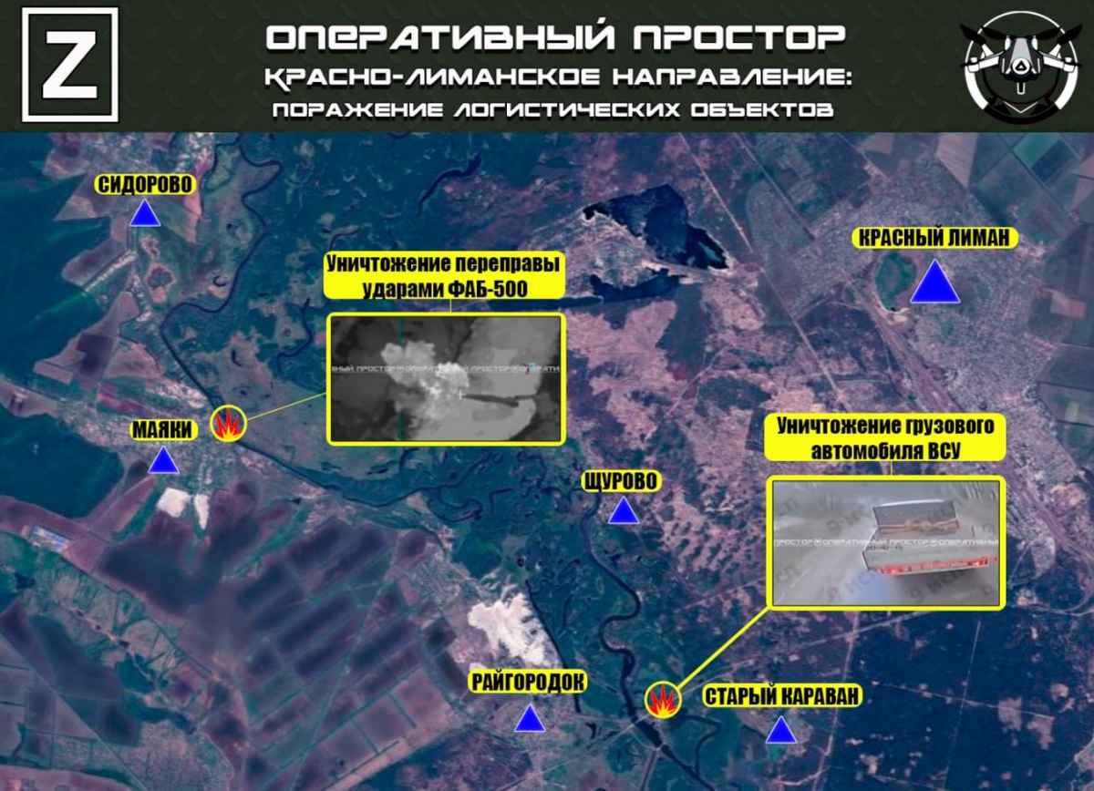 За последние дни ВС РФ нарастили количество ударов по по тылу противника на Красно-Лиманском направлении. Основными транспортными артериями противника остаются дороги на запад и на юг, пересекающие реку Северский Донец. На западной дороге инженерные подразделения ВСУ постоянно пытаются восстановить переправу в районе н.п. Маяки (в очередной раз уничтоженную ударами ФАБ-500), а на юге – в районе н.п. Райгородок близ разрушенных мостов. Когда противник восстанавливает переправы на короткое время, движение по ним обрабатывают наши FPV-дроны. ✌️Честь и хвала нашим авиаторам и дроноводам! Оперативный простор