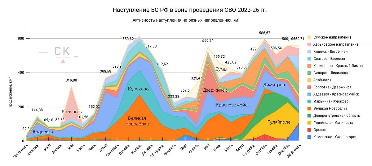 Инфографика интенсивности наступления ВС РФ в зоне СВО на различных направлениях к февралю 2026.