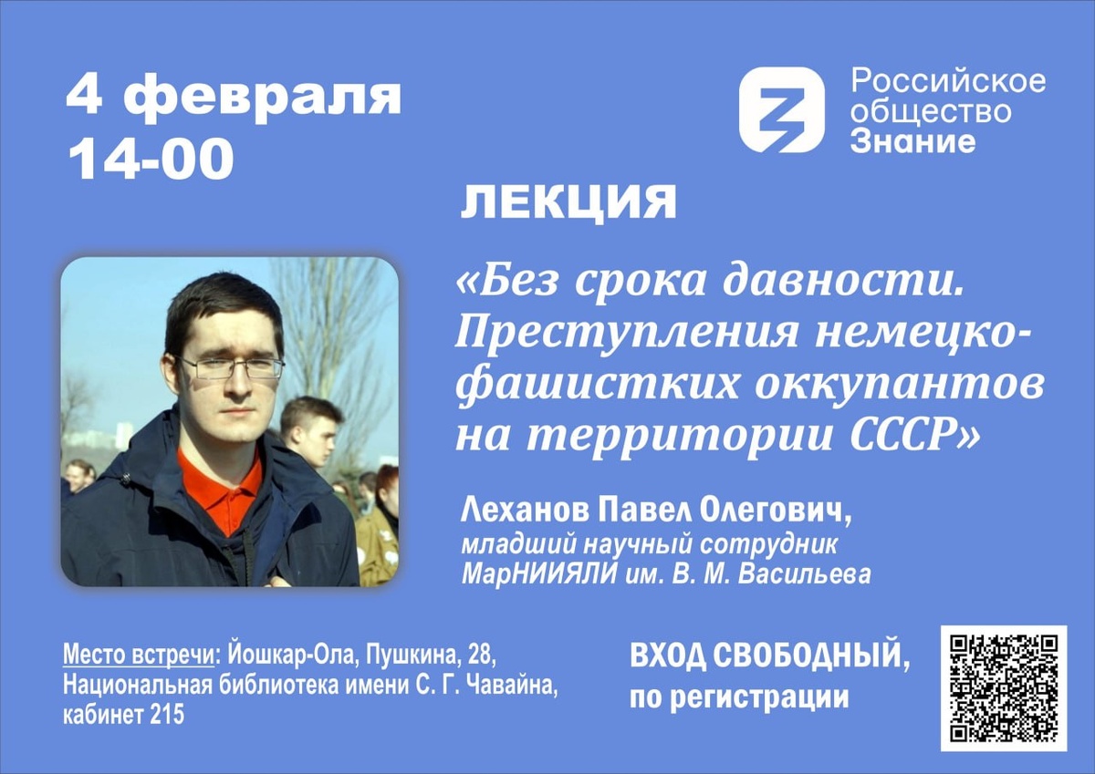 Завтра, 4 февраля, в Национальной библиотеке имени С.Г. Чавайна состоится лекция регионального отделения Российского общества «Знание». Тема лекции будет посвящена преступлениям немецко-фашистских захватчиков на территории СССР. Спикером выступит младший научный сотрудник МарНИИЯЛИ им. В. М. Васильева Павел Леханов, сообщает газета «Йошкар-Ола». Начало лекции в 14:00. Вход свободный, но необходима регистрация.