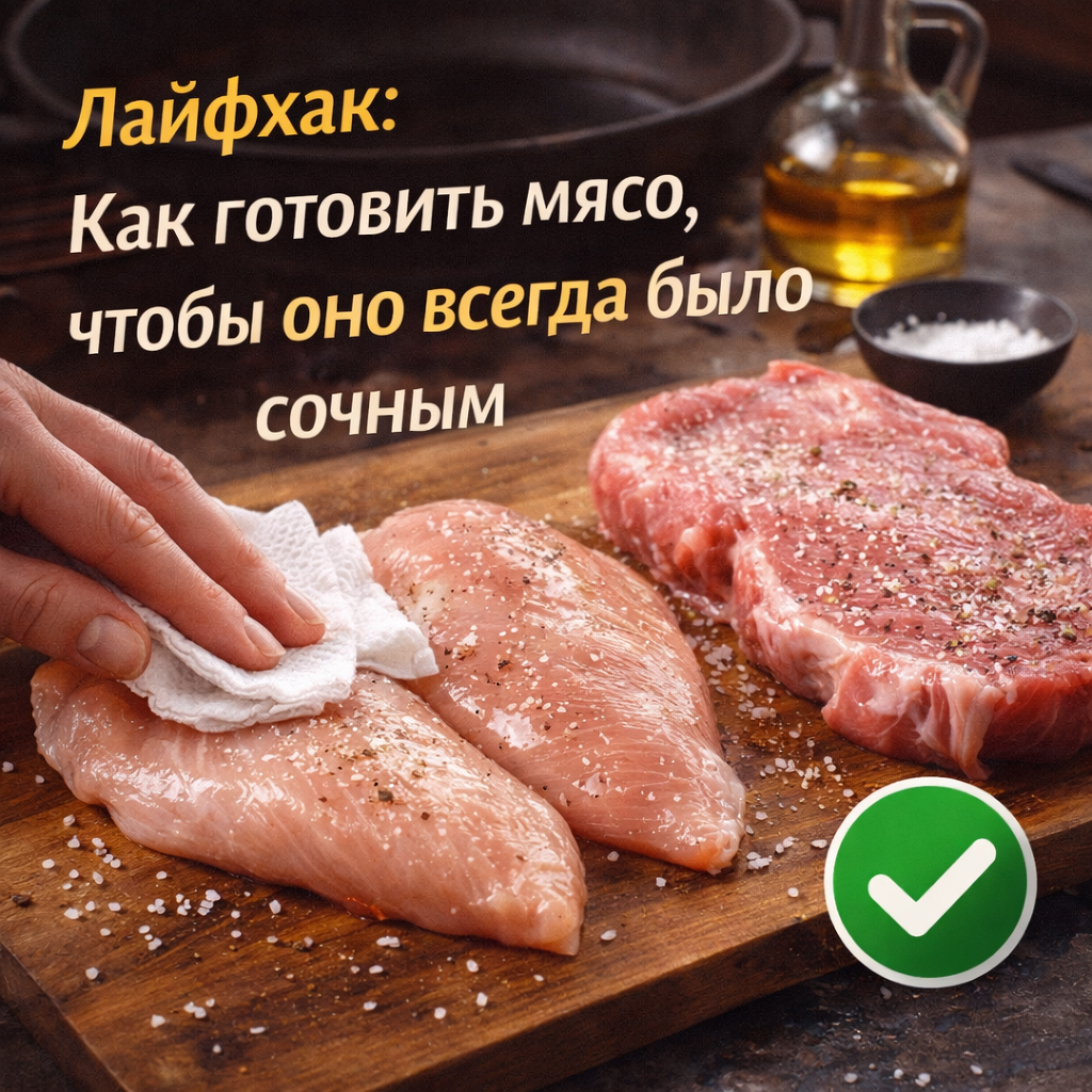 Я долго мучилась, пока не узнала один секрет, который изменил всё. Теперь любое мясо — сочное, мягкое, как будто из ресторана. Перед тем как жарить или запекать мясо, я делаю маленькую, но важную подготовку: И никакой лишней маринады, специй или часов ожидания не нужно. Итог: корочка равномерная, мясо сочное, сок остаётся внутри. Если готовите стейк или курицу целиком — можно добавить щепотку специй после обжарки, чтобы аромат раскрылся, а мясо не пересохло. А вы знали этот простой способ?