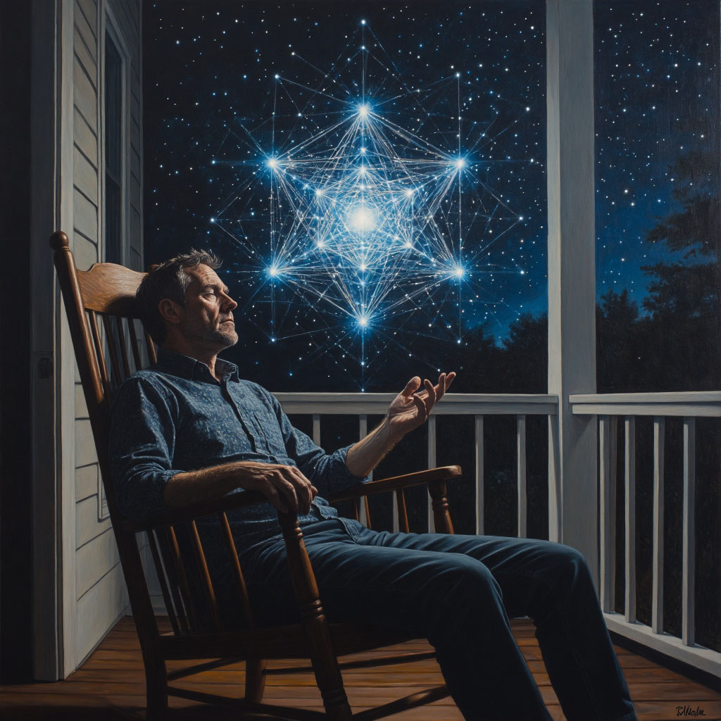 Джонатан сидел на своём крыльце, как делал каждую ночь, слушая звуки пустыни — стрекот цикад, далёкий вой койота, шелест кактусов на ветру. Внезапно он почувствовал странное давление в висках, как будто кто-то надел на его голову слишком тугую шапку. Затем перед его слепыми глазами начали появляться точки. Не просто случайные световые вспышки, которые иногда видят слепые люди, а упорядоченные, геометрически точные точки света. Они располагались в определённом порядке, образуя узоры, которые Джонатан не мог видеть, но мог ощущать их расположение в пространстве перед собой.