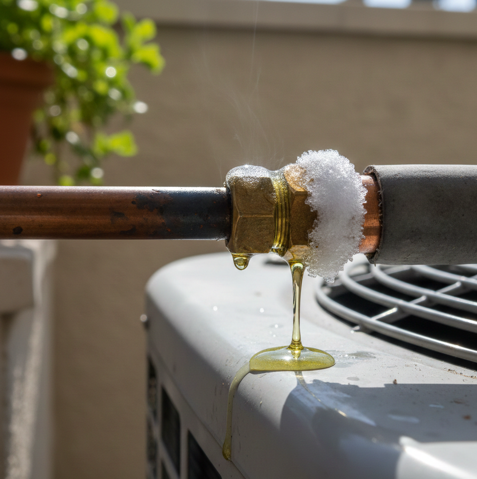 - Симптом: Масляные пятна на стыках (на внешнем или внутреннем блоке). Фреон испаряется, а компрессорное масло остается.