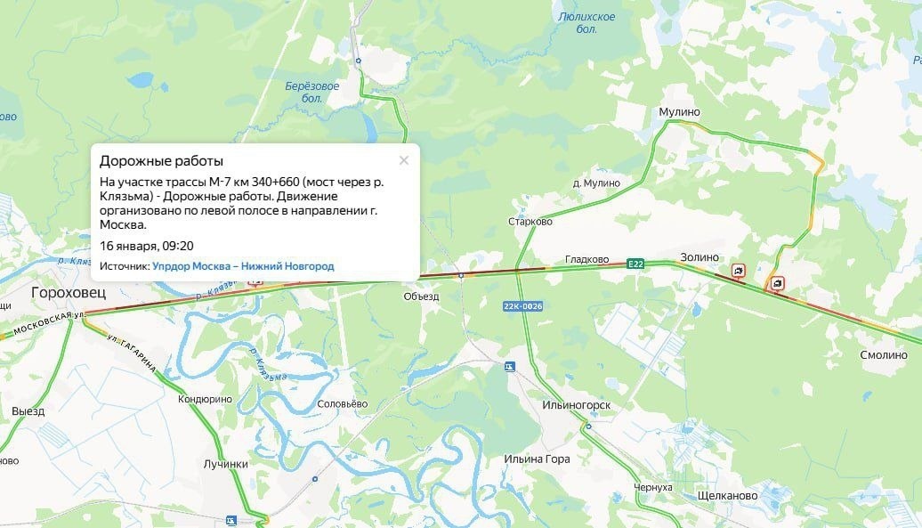 Идут дорожные работы на мосту через Клязьму в Гороховецком районе. Движение в сторону Москвы организовано по левой полосе, сообщает Упрдор Москва — Нижний Новгород. Судя по карте, пробка длиной почти 30 км начинается от поселка Смолино в Нижегородской области и заканчивает в Гороховце. Мало того, что дорожники затеяли ремонт, так еще и сама проезжая часть не чистится от снега и наледи, особенно на участке во Владимирской области. Из-за этого в сторону Москвы ранее уже скапливались огромные пробки. Прокуратура начала проверку из-за плохой уборки. Подписаться на новый Вязниковский ТГ-канал