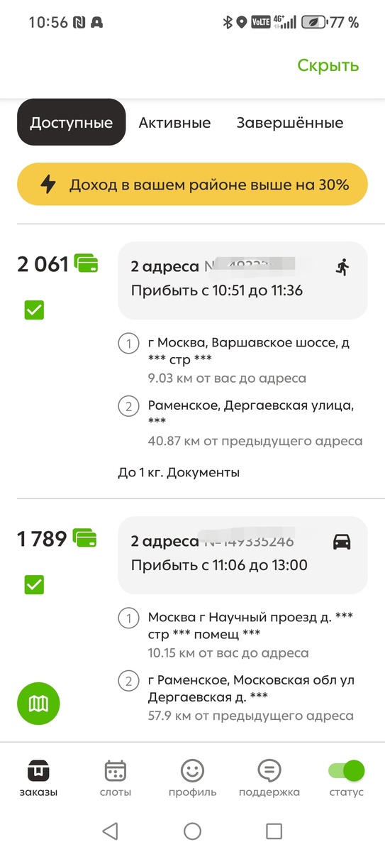 Сразу этот скрин скинула Ярославу, но он не увидел, что оба заказа к одному получателю в Раменском 😁Видимо кто-то тоже этого не заметил и через 10 минут автозаказ взяли, а пеший так и остался висеть.