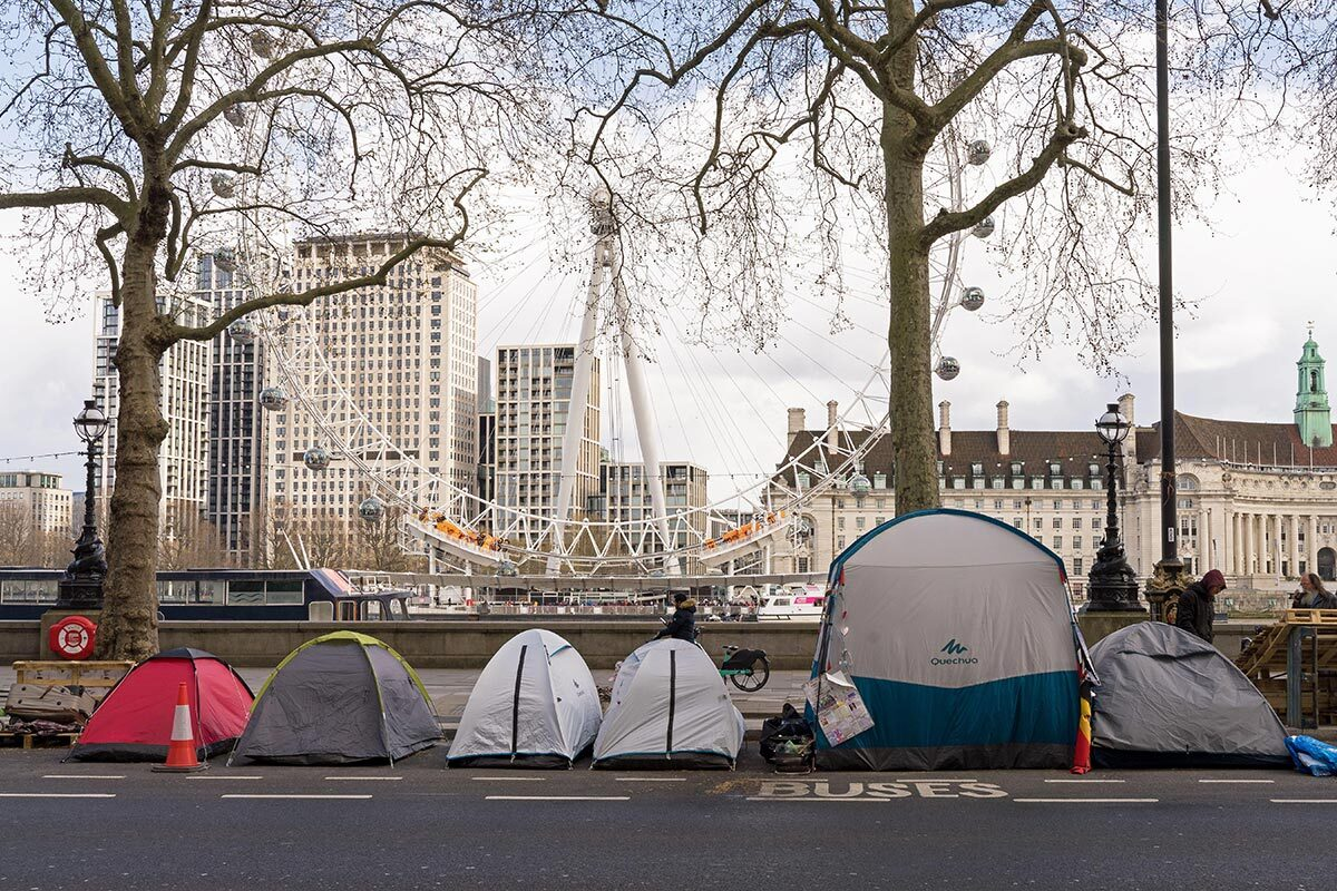 Количество людей, спящих на улицах, выросло втрое за последние три года. В 2025 году было зафиксировано около 13 тысяч человек, ночующих под открытым небом. Они живут в палатках под мостами, в подземных переходах, в парках, на ступеньках зданий. Центральный Лондон, особенно район вокруг Оксфорд-стрит и Вестминстера, превратился в лагерь бездомных.
