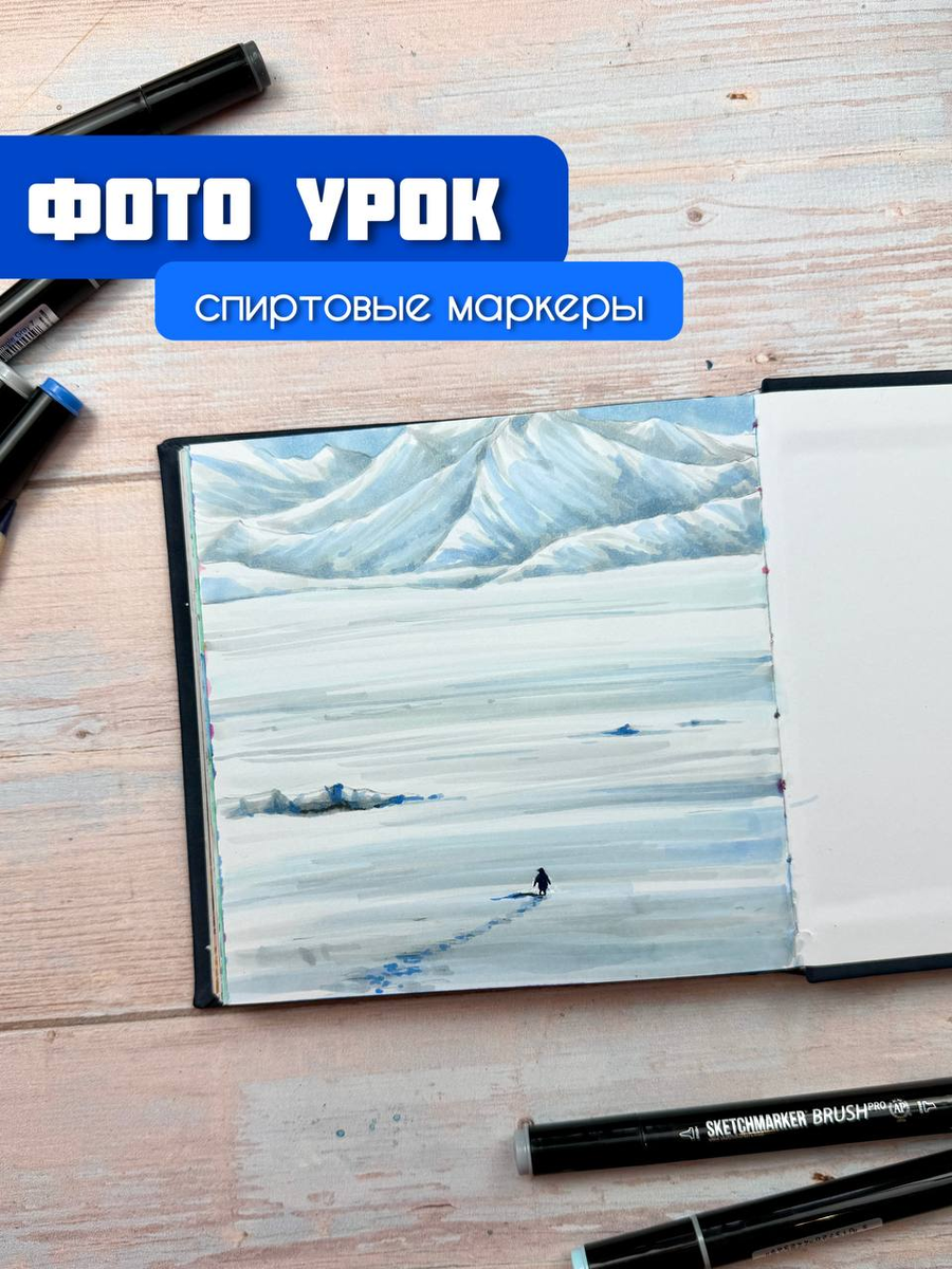 ❄️ Встречайте новый фото урок от Dari Art! Рисуем атмосферный скетч с пингвином спиртовыми маркерами и погружаемся в холодную и трогательную историю одинокого путешественника. 🐧 Потребуется: · Бумага или скетчбук для спиртовых маркеров (в уроке скетчбук от Малевичъ, товары для художников (http://t.me/maleviches_brand) · Спиртовые маркеры: светло-серый (SG7), серый (SG6), светло-голубой (B24), голубой (B63), синий (B92), черный (SG1) (используется палитра маркеров от SKETCHMARKER. (https://t.me/sketchmarkersketchclub) · Простой карандаш и ластик Переходим к созданию рисунка: Шаг 1: Набросок Мягким карандашом намечаем композицию. Вдали — силуэты гор. На переднем плане — небольшой силуэт пингвина. От него к нам убегает дорожка следов, создавая глубину. Шаг 2: Светло-серый (SG7) Начинаем добавлять цвет! Этим оттенком затемняем небо и обозначаем первый рельеф на горах. Также кладём легкий тон на снежную равнину, чтобы область ближе к нам стала чуть темнее. Шаг 3: Серый (SG6) Усиливаем рель