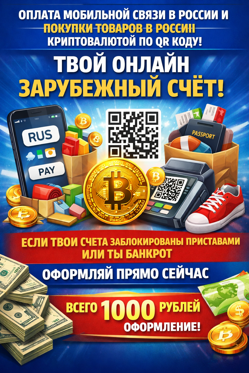 В эпоху, когда финансовая независимость на вес золота, не позволяйте блокировкам остановить вашу жизнь. Оформите зарубежный онлайн-счет за 1000 рублей и наслаждайтесь оплатой товаров и мобильной связи криптовалютой по QR-коду в России. Это не просто счет — это ваш ключ к свободе платежей в рублях, крипте или любой другой валюте. Не откладывайте: заявку можно отправить прямо сейчас через Telegram, и вы будете готовы к транзакциям уже сегодня!