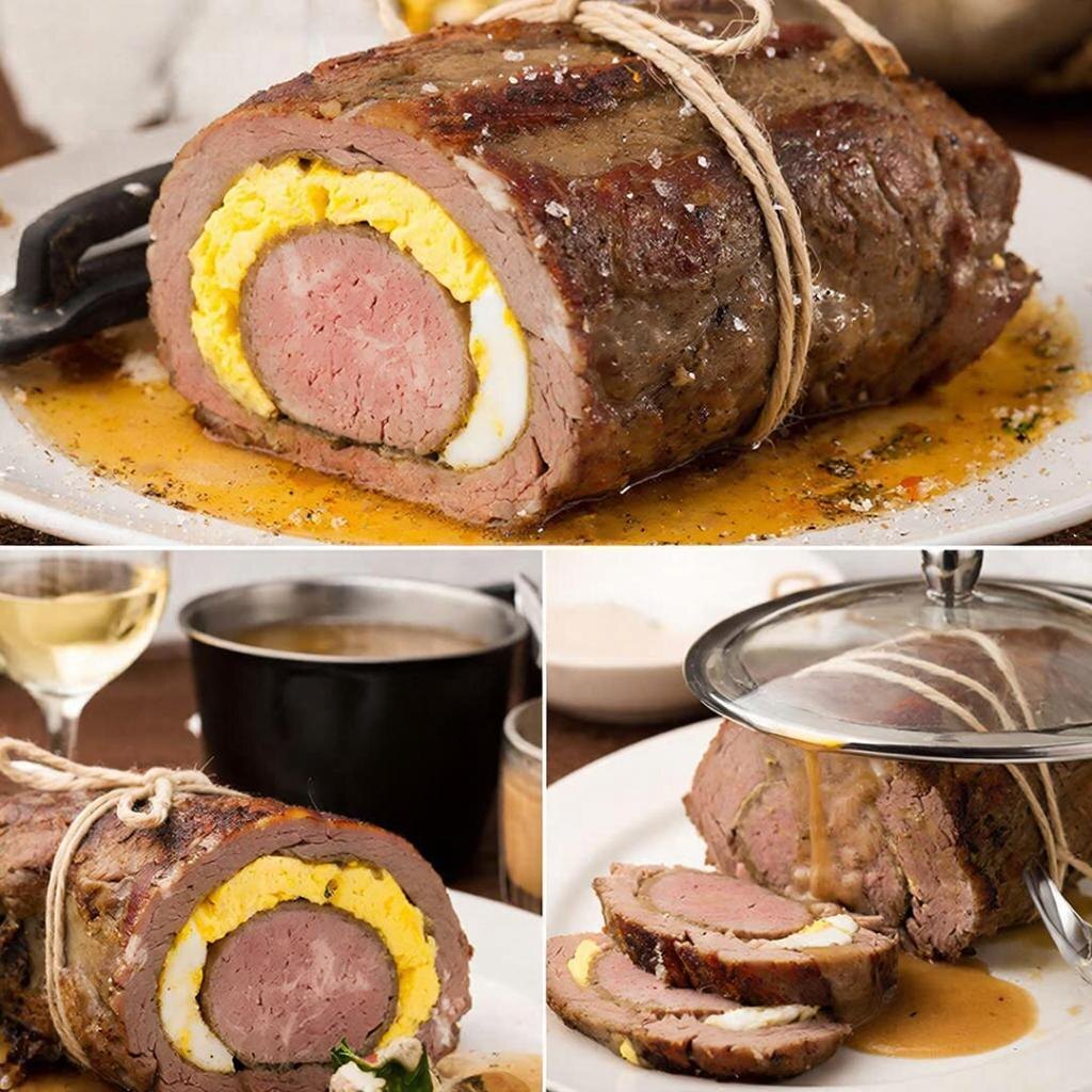 - Выбор мяса: Для "Трехцветного рулета" идеально подходит говяжья вырезка или тонкий край. Эти части мяса нежные и легко отбиваются, что обеспечивает равномерное приготовление и мягкость готового блюда. Если вы используете более жесткие части, увеличьте время тушения.