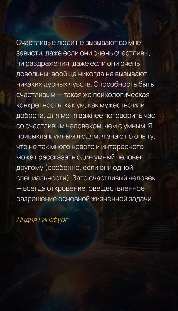 Счастливые люди не вызывают во мне зависти, даже если они очень счастливы, ни раздражения, даже если они очень довольны: вообще никогда не вызывают никаких дурных чувств. Способность быть счастливым — такая же психологическая конкретность, как ум, как мужество или доброта. Для меня важнее поговорить час со счастливым человеком, чем с умным. Я привыкла к умным людям: я знаю по опыту, что не так много нового и интересного может рассказать один умный человек другому (особенно, если они одной специальности). Зато счастливый человек — всегда откровение, овеществлённое разрешение основной жизненной задачи. Лидия Гинзбург Архитектура вашей души | Натальная карта T | VK | Pin | YouTub | Dzen #трансформацияличности #витальность #верьвсебя #полезно #психосоматика #ясностьмысли #энергетика #счастье #лайфхак #3число #3февраля