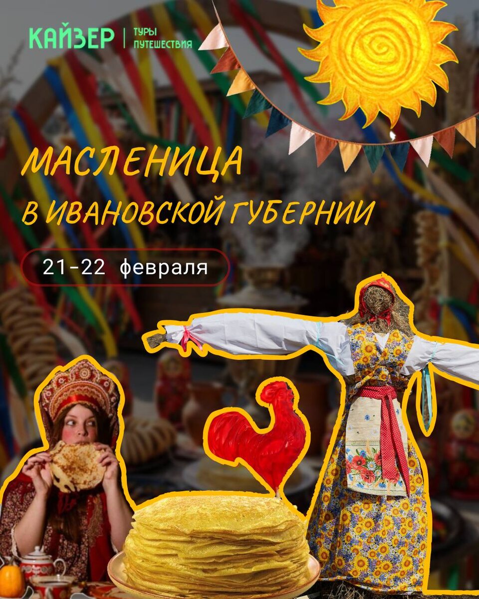 ! Вижу все сообщения по поводу недельных летних и осенних туров, до 10 февраля будут внесены все корректировки 🙌🏻 сразу отправлю по вашим запросам и постепенно буду анонсировать здесь А сегодня хочу пригласить вас в двухдневное масленичное путешествие по Ивановской губернии!☀️ Проводим зиму в атмосферных ремесленных селах 🥞 📅21-22 февраля 👥9 мест 💳21.900 Программа: https://kaizertravel.ru/maslenitsa
