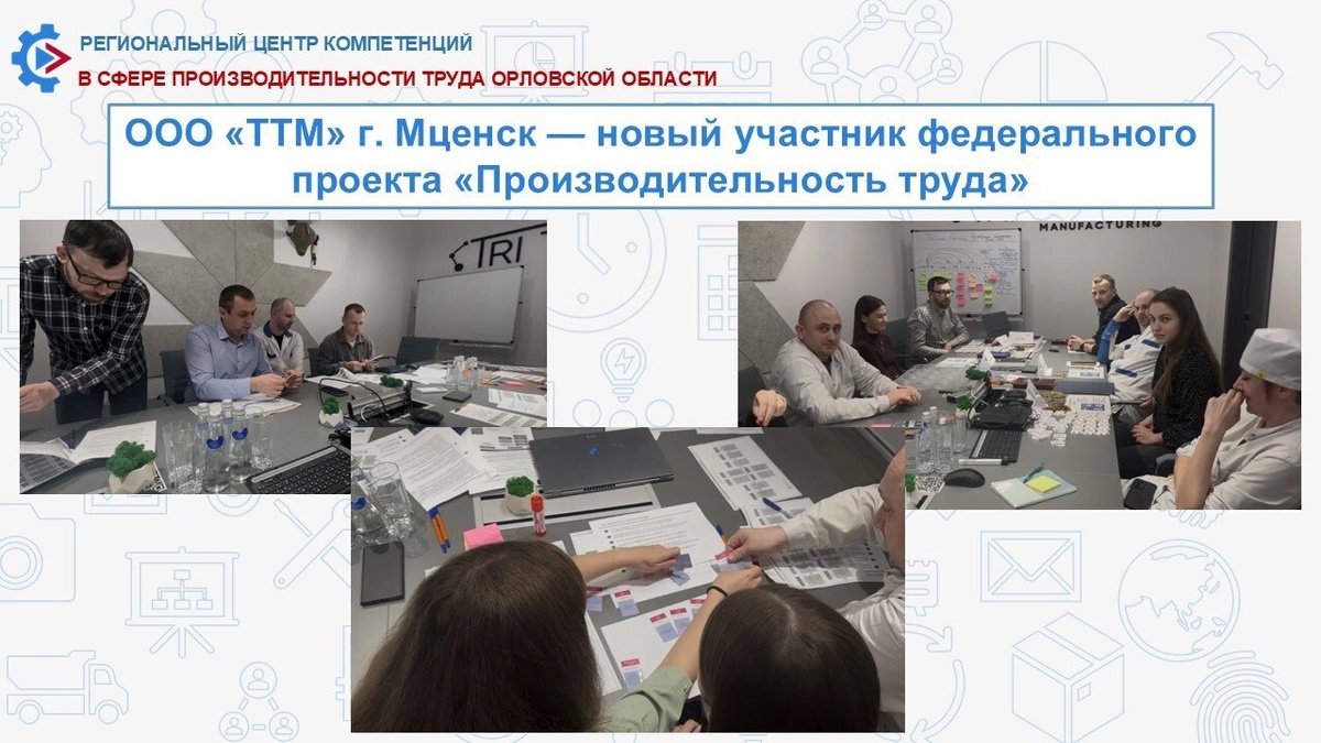 Команда ООО «ТТМ» (город Мценск) совместно с экспертами Регионального центра компетенций (РЦК) Орловской области в течение 6 месяцев будет работать над проектом. Его цель - сокращение затрат в потоке изготовления автоматизированной информационной системы «ЭРА-ГЛОНАСС». Этапы реализации проекта 1. Обучение (текущий этап) Изучение инструментов бережливого производства. Знакомство с основами методологии, производственным анализом, системой 5С и картированием процессов. 2. Диагностика (следующий этап) Подробный анализ производственных процессов на предприятии. Если вас интересует участие в федеральном проекте «Производительность труда», обращайтесь в Региональный центр компетенций Орловской области. Телефон: +7(910) 265-10-01 E-mail: rck57@mail.ru Адрес: г. Орел, ул. Тургенева, 23 Сайт: rck.frpoo.ru #ПроизводительностьРФ #ФедеральныйПроектПроизводительностьТруда #НацПроектЭкономика
